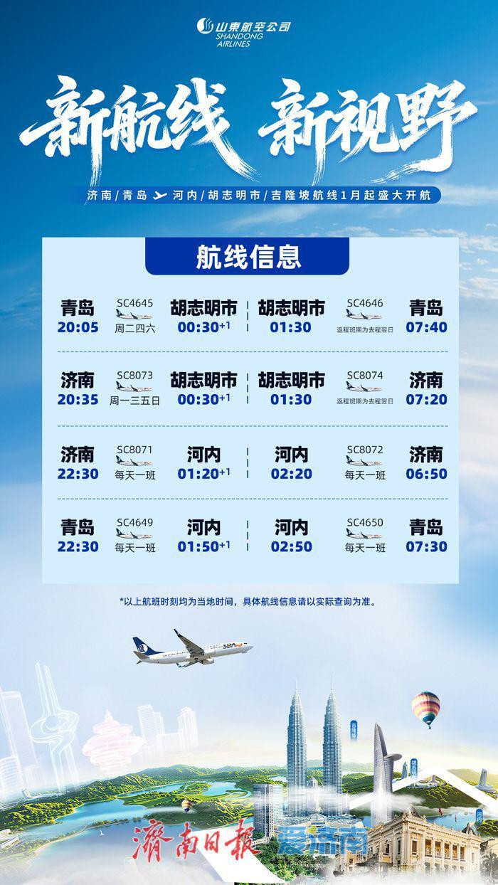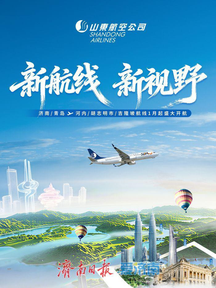 2026年1月起,山东航空将正式开通由济南、青岛往返越南河内、胡志明市以及马来西亚吉隆坡的直飞航线。