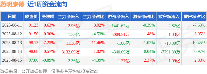 资金流向数据方面,本周药明康德主力资金合计净流入11.19亿元,游资资金合计净流入5895.05万元,散户资金合计净流出11.78亿元。本周资金流向一览见下表: